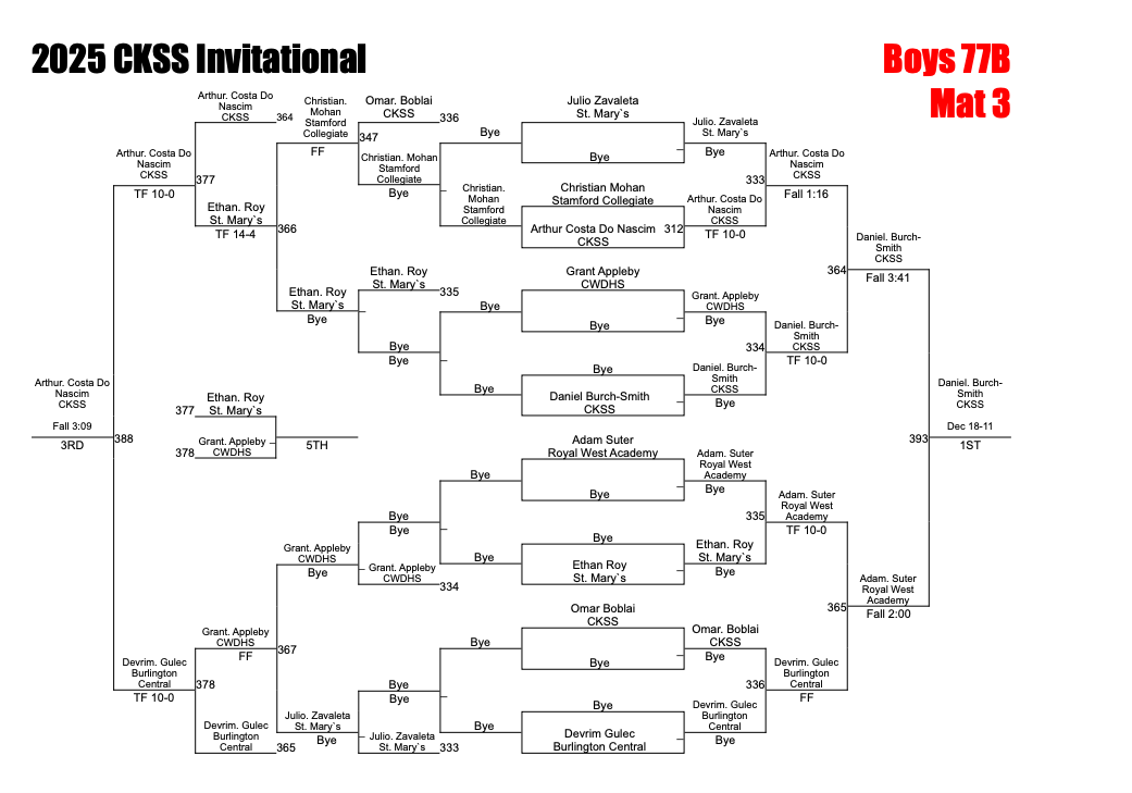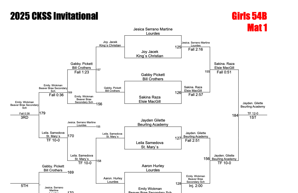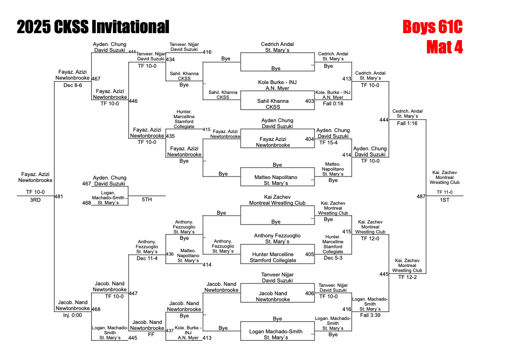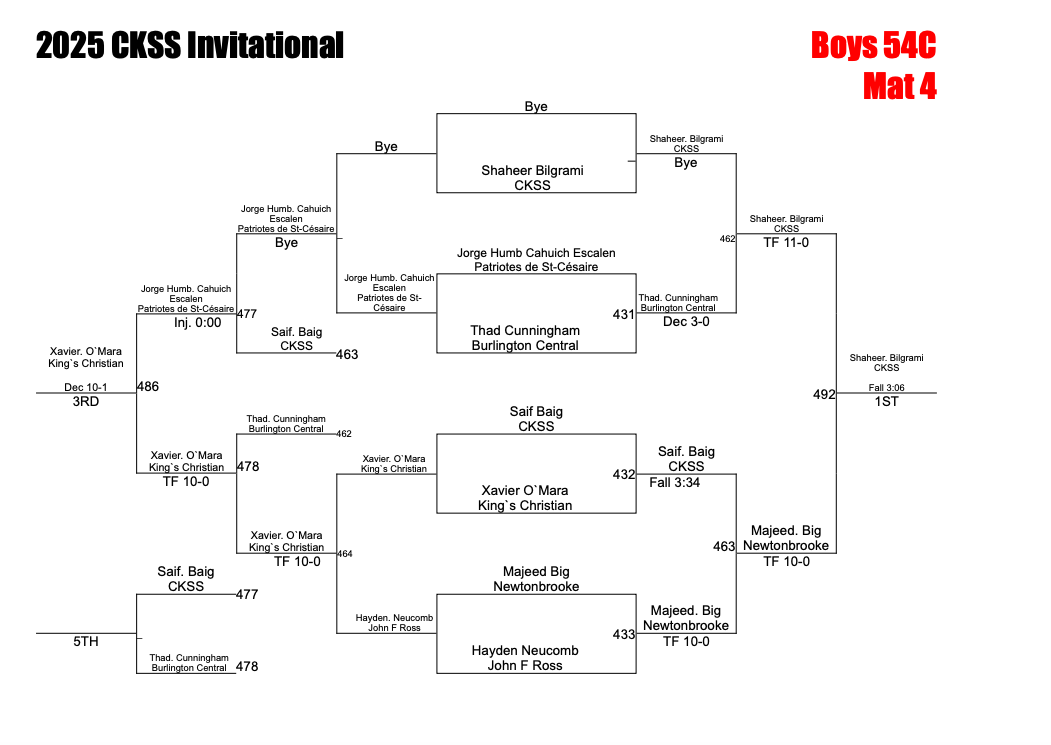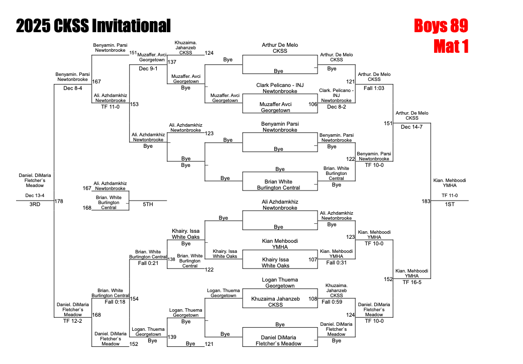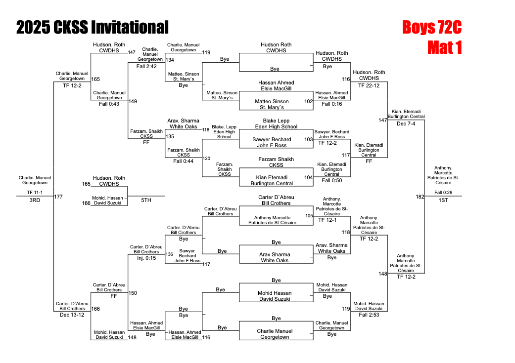 Three tournaments took place in Ontario, the weekend of December 12th to the 14th. The CKSS tournament, the Bishop Ryan Invitational and the Matmen Classic were set to close out the year for 2025. Quebec clubs were in full attendance as Beurling Academy, CLIC, the Club de Lutte Lasalle, Concordia University, The Crazy Dogs, Heritage Regional High School, Lower Canada College, the Kartal Wrestling Club, KSS, the Montreal Wrestling Club NTC, les Patriotes de St-Cesaire, the Riverdale Wrestling Club, Royal West Academy, the Tritton Performance Wrestling Club, Vanier College and the YMHA Wrestling Club , all sent athletes to the events with the the following results: